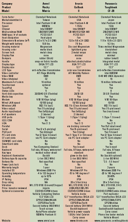 All three responded. Amrel sent their Rocky Matrix, Itronix an early sample of their GoBook II, and Panasonic a Toughbook CF-28. To give you an idea of where they fit in, let's use an automotive comparison: The Matrix, GoBook, and Toughbook are to standard notebook computers like a real offroad four-wheel-drive vehicle is to a family sedan. They are not quite military-grade HumVees, but they are definitely more than a soccer mom SUV. Their footprints are no bigger than that of a standard notebook, but they are thicker to add structural strength and integrity, and room for internal expansion and accommodation of special customer requests. They weigh more than standard full-size notebooks, but not by all that much. Unlike ultra-rugged devices which often give up features and flexibility in favor of doing just one job exceptionally well (like surviving in a sand storm), these hardened notebooks offer most or almost all the speed, features, and flexibility of a standard consumer notebook computer.