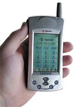 When I removed it from the box, I was surprised the size of the new Samsung i300. While not as small as the relatively standard Nokia 6100-series, which I've considered a benchmark cell phone for a year or so, it's comfortable to hold and use, not at all a burden to carry. This has been the main complaint about PDA/cell phones of the past, like the Kyocera Smartphone and the pdQ before it, as well as the VisorPhone/Visor combination. These phones kept the screen size large for easy readability, and have not sold as well as they should, likely because of size alone.