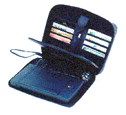 | The new Morgan slimline case was created for people who want the smallest, easiest to carry case for their handheld computer without sacrificing utility. It features an expandable webbed pouch for cables and things, three secure PC Card slots, spaces fot ten credit cards, a money pouch, a checkbook pocket, and a space for two pens. Your computer is held in place with either the web pouch or the supplied Velcro circles. | |||||||||||||||